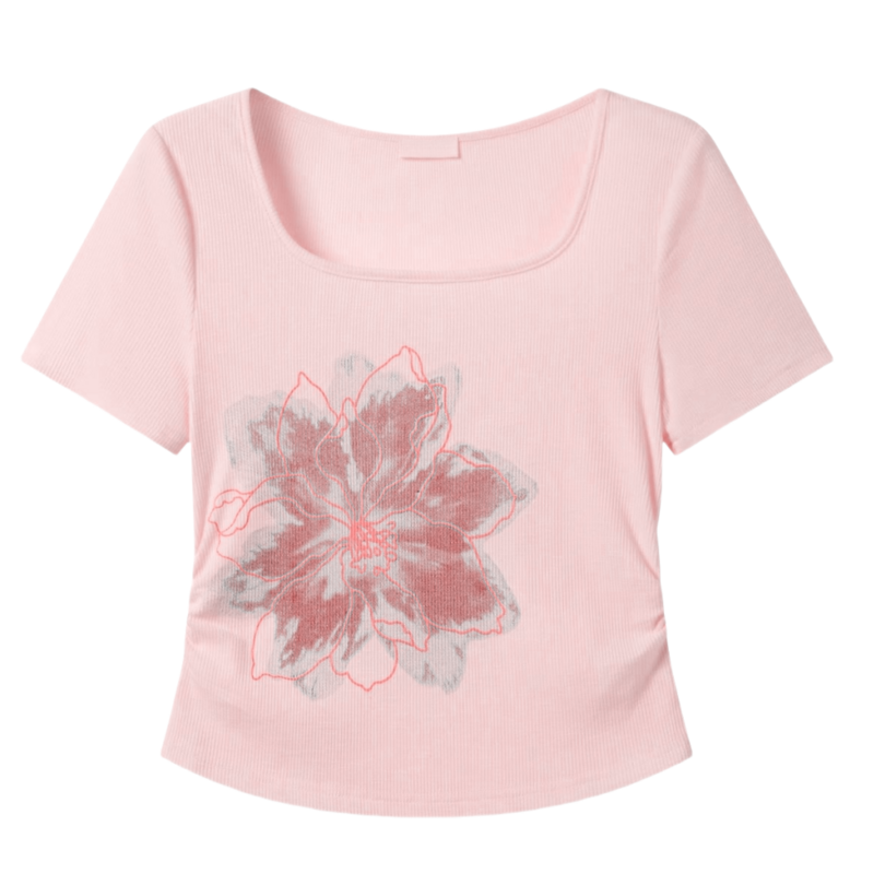 - Almond Floral Print U-Neck T-Shirt